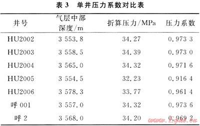 根據(jù)單井初期不穩(wěn)定試井資料,將氣井初期地層壓力折算至統(tǒng)一海拔深度,扣除投產(chǎn)時(shí)間晚2a的HU2005井和HU2006井,其余井壓力系數(shù)在0.9716~0.9736之間(表3),相對偏差較小,在0.05%~0.1%,說明未投產(chǎn)前各井同屬一個(gè)壓力系統(tǒng)。