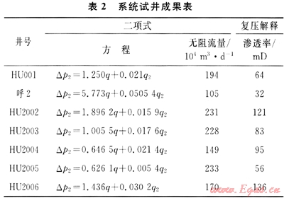 應(yīng)用壓力恢復(fù)、壓降、系統(tǒng)試井和一點(diǎn)法等多種試井方法研究儲層物性及產(chǎn)能特點(diǎn)。確定了各氣井較為真實(shí)可靠的產(chǎn)能方程(表2),為新井配產(chǎn)提供了依據(jù);同時(shí),運(yùn)用三維建模和數(shù)值模擬技術(shù),確定了合理井距為1400m,為實(shí)現(xiàn)稀井高產(chǎn)創(chuàng)造了條件。