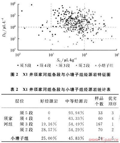 X1井粉砂質(zhì)頁巖、頁巖、碳質(zhì)頁巖和煤層全部分布于須家河組和小塘子組。根據(jù)標(biāo)準(zhǔn)發(fā)現(xiàn)須5段和須4段以中等烴源巖為主,無好烴源巖;須3段、須2段和小塘子組以中等烴源巖為主,好烴源巖相對豐富(圖2)。根據(jù)好烴源巖與中等烴源巖之和對烴源巖優(yōu)劣進(jìn)行排序,認(rèn)為須3段最優(yōu)、須2段其次、須5段和須4段較差、小塘子組最差(表2)。此認(rèn)識與劉華等2002年對四川盆地上三疊統(tǒng)有機(jī)碳含量的研究成果相符[3]。