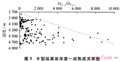 對于同類型烴源巖,其DC1~2/DC3~5或者DC1/DC4~5隨著深度的增大(或者成熟度升高)而變大(圖5),A型和C型具有同樣的變化趨勢。