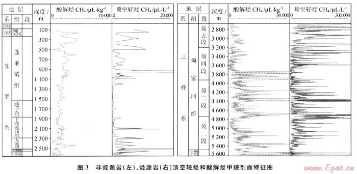 酸解烴所測的是歷史時期被礦物顆粒吸附和膠結(jié)物所捕獲的甲烷及其同系物,一般認(rèn)為其能夠反映歷史時期烴源巖的生烴特征和早期烴類大規(guī)模運(yùn)移特征,是歷史累積效應(yīng)的反映;而頂空輕烴所測是目前巖石礦物顆??紫?、裂縫中的甲烷及其同系物,反映的是現(xiàn)今地層含油氣特征及最近一期大規(guī)模運(yùn)移特征。