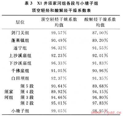 另外,一般烴類從烴源巖到儲層或者蓋層的運(yùn)移,如無外源加入,甲烷運(yùn)移速度最快,總會在運(yùn)移路徑上呈干燥系數(shù)變大的特點(diǎn)。但是X1井干燥系數(shù)在須家河組各段和小塘子組從下至上明顯逐漸減小。分析認(rèn)為此特征應(yīng)為烴源巖生烴作用造成,因此也可確定須家河組和小塘子組為烴源巖層(表3)。