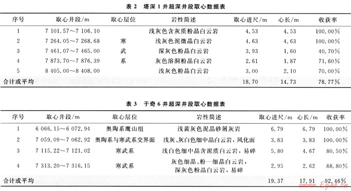 于奇6井是中國石化西北油田分公司在阿克庫勒凸起北東斜坡帶布置的一口重點超深探井,位于新疆輪臺縣境內(nèi),地處沙漠邊緣但靠近天山,完鉆井深7510m,目的層是中-下奧陶統(tǒng)鷹山組、蓬萊壩組和寒武系。本井在超深井段取心4次,使用250P取心工具,取心情況如表3所示。