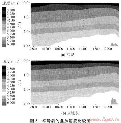 目前的疊加速度將受近地表淺層低速帶的影響。對習(xí)慣于用疊加速度作偏移,甚至用疊加速度作時(shí)一深轉(zhuǎn)換的做法可能認(rèn)為不妥,只需將速度作個(gè)基準(zhǔn)面校正或以一定長度的平滑濾波,去掉高頻成分,還是可以應(yīng)用的(圖5)。但這都是在一般比較平緩構(gòu)造下的情況,在高陡復(fù)雜構(gòu)造情況下,還是要先作DM0,經(jīng)DM0后所掃速度才能為偏移和時(shí)深轉(zhuǎn)換提供比較合理的速度。從圖5-b可看出,淺層層次感更清楚、橫向更穩(wěn)定。