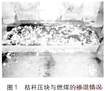與煤混燒的是花生秧秸稈壓塊,其形狀為長方體,尺寸為30mm×30mm×70mm,運輸過程造成少量壓塊破碎成小塊,但粉末狀顆粒所占比例可忽略。由于成型過程中添加劑的影響,秸稈壓塊中灰的質(zhì)量分?jǐn)?shù)約15%,低位發(fā)熱量約14562kJ/kg?;鞜^程中,秸稈壓塊與燃煤的摻混比例(質(zhì)量比)為20%~30%。采用人工摻混,煤斗內(nèi)的混合情況見圖1,兩者混合比較均勻。