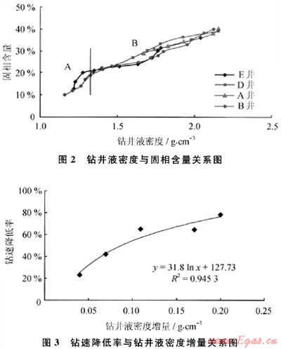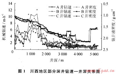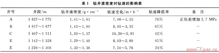 通過統(tǒng)計分析川西地區(qū)5口深井實(shí)鉆資料,認(rèn)為以下鉆井液因素對鉆速存在影響。