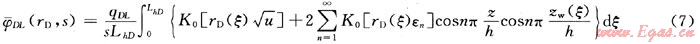 對于頂?shù)追忾]橫向無限大氣藏,滲流空間中任意位置(xw,yw,zw)的長度為ls的連續(xù)線源對(x,y,z)處產(chǎn)生的無因次壓降的Laplace空間解為: