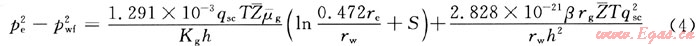 為氣體黏度,mPa·s;qsc為標(biāo)準(zhǔn)狀況下的產(chǎn)氣量,m3/d;rw為井底半徑,m;re為供給半徑,m;β為速度系數(shù),m-1;S為表皮系數(shù);rg為天然氣的相對密度。