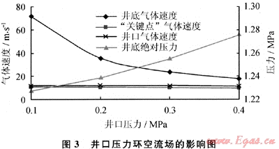 從井口壓力對(duì)環(huán)空流場(chǎng)的影響曲線(圖3)可以看到,井口壓力從0.1MPa增加到0.4MPa,井口、“關(guān)鍵點(diǎn)”、井底氣體速度分別減小75%、6.0%、3.8%,井底壓力增加3.99%,井口加載一定回壓后,上部井段環(huán)空流速明顯減小,削弱了夾雜固體顆粒的高速氣流對(duì)環(huán)空井壁和鉆具的沖蝕作用,而井口回壓的增加并不會(huì)明顯影響井底壓力。所以,通過在井口加載一定回壓,可實(shí)現(xiàn)對(duì)上部井段環(huán)空流場(chǎng)的改善。