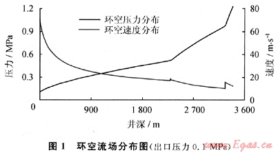 采用建立的計(jì)算模型,對(duì)氣體鉆井環(huán)空流體動(dòng)力學(xué)進(jìn)行了數(shù)值模擬。根據(jù)壓力分布圖可知(圖1),在下部井段(尤其是鉆鋌段)環(huán)空壓力下降較快,鉆鋌段長(zhǎng)度僅占總井深的3.97%,壓降卻達(dá)到了整個(gè)環(huán)空壓降的20.8%。環(huán)空速度場(chǎng)沿井深分布不均,在“關(guān)鍵點(diǎn)”(實(shí)質(zhì)是鉆鋌與鉆桿連接處、存在截面突變那一段)和井底,氣流速度分別為10.01m/s和11.49m/s,該處容易出現(xiàn)井眼凈化不良的問題。氣體在向上運(yùn)移過程中,減壓膨脹,到達(dá)井口時(shí),流速達(dá)到71.61m/s,是“關(guān)鍵點(diǎn)”氣流速度的7.15倍,遠(yuǎn)遠(yuǎn)超出了井眼凈化的要求,夾雜固體顆粒的高速氣流必將對(duì)環(huán)空井壁和鉆具造成沖蝕。