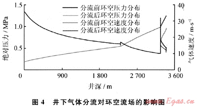 通過井下氣體分流器(DHAD)分流20m3氣體后(圖4),環(huán)空氣體分流處產(chǎn)生了約0.3MPa的局部壓降,井底壓力降低了21.2%。下部井段環(huán)空壓力降低,氣體膨脹,流速加快,攜帶巖屑能力得以提升。實(shí)現(xiàn)了改善下部井段環(huán)空流場(chǎng),降低井底壓力和注氣壓力的目的。數(shù)值模擬表明采用全井段環(huán)空流場(chǎng)改善方法可實(shí)現(xiàn)以下目的。