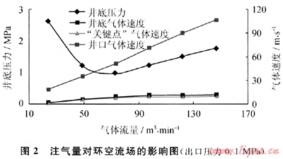 取不同注氣量對(duì)氣體鉆井環(huán)空流場(chǎng)進(jìn)行了數(shù)值模擬,結(jié)果表明:井底壓力隨注氣量的增加先減后增,存在一個(gè)臨界點(diǎn)(圖2)。計(jì)算條件下,注氣量從97.96m3/min增加到146.94m3/min,“關(guān)鍵點(diǎn)”、井底氣體速度僅增加4.4%和4.0%,而井口氣流速度卻增加了近5倍。所以超過一定值后,繼續(xù)增加注氣量,并不能有效提高下部井段氣流速度,從而提高下部井段井眼凈化能力,反而會(huì)導(dǎo)致上部井段沖蝕嚴(yán)重和水力能量的不必要浪費(fèi)。