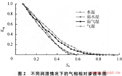 圖2給出了不同潤濕條件下的氣相相對滲透率曲線。在每一飽和度下,水濕巖樣的氣相相對滲透率總比氣濕巖樣的氣相相對滲透率低很多,這給出了一個可在油田應用的潛在方法:對致密氣藏,改變近井地帶的潤濕性,使其由水濕變?yōu)闅鉂?,可以增加氣體的滲流能力,提高產(chǎn)量或注入量。值得注意的是,當水飽和度大于0.4時,氣體的相對滲透率按照水濕→弱水濕→弱氣濕→氣濕的順序依次增加;但當水飽和度小于0.4時,相對滲透率增加的次序性被打亂,在弱水濕情況下表現(xiàn)為最小。
