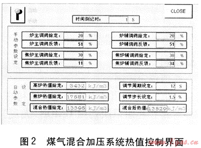 在這個控制系統(tǒng)中,高爐煤氣的熱值、焦?fàn)t煤氣的熱值、混合煤氣的給定熱值、閥門調(diào)節(jié)的周期、閥門調(diào)節(jié)的步長都可以在操作界面上直接輸入,見圖2。此控制系統(tǒng)使用起來非常方便,調(diào)節(jié)后的熱值也可以即時顯示。通過WCC系統(tǒng)軟件,可以調(diào)出任何時刻的煤氣混合情況。