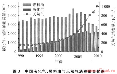 天然氣市場(chǎng)現(xiàn)正處于高速增長(zhǎng)的時(shí)期。在西氣東輸項(xiàng)目完工并于2004年10月開(kāi)始向華東地區(qū)供氣后的5年里,國(guó)內(nèi)天然氣消費(fèi)量年均增幅達(dá)17%,2009年消費(fèi)量已增加到874×108m3[6]。而在這之前,20世紀(jì)90年代10年里的年均增幅只有4.5%。2010年,國(guó)內(nèi)天然氣消費(fèi)量估計(jì)將達(dá)到1050×108m3,到2020年預(yù)計(jì)將增長(zhǎng)兩倍達(dá)到3000×108m3,受沖擊最大的是燃料油和液化氣,液化氣需求增長(zhǎng)將受到嚴(yán)重阻礙(圖3)。
