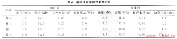 在生產(chǎn)過程中,常出現(xiàn)油套壓差增大的情況,說明井底或井筒中有積液,如果氣井井底或井筒積液嚴重,對氣井的生產(chǎn)會帶來很大的影響。由于低產(chǎn)井的產(chǎn)能普遍比較低,部分井的產(chǎn)量不能滿足攜液要求,如果積液不及時帶出,將嚴重影響氣井連續(xù)穩(wěn)定生產(chǎn)。為了更好地發(fā)揮氣井產(chǎn)能,結(jié)合泡沫排水采氣工藝,針對油套壓差相對較大、井底或井筒中有積液的氣井,間歇性加入起泡劑,排除凝析水,延長開井周期。目前在榆林南區(qū)正大面積推廣[2~3](表4)。