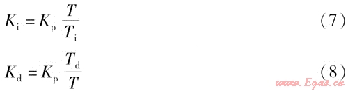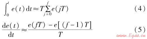 在上述離散化過程中,T必須足夠短才能保證采樣精度。為書寫方便,將e(fT)用e(f)表示,將式(4)、(5)代入式(2),化簡后可得離散的PID表達式為:
