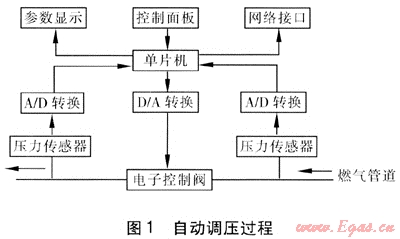 操作者通過控制中心遠程或控制面板現(xiàn)場設(shè)定出口壓力值。在現(xiàn)場站點的入口和出口處均設(shè)有壓力傳感器,實時將入口、出口側(cè)的壓力信號經(jīng)模擬/數(shù)字信號(A/D)轉(zhuǎn)換器輸入單片機,并可在液晶屏幕上實時顯示。當出口壓力低于設(shè)定值時,單片機發(fā)出的數(shù)字控制信號經(jīng)數(shù)字/模擬信號(D/A)轉(zhuǎn)換器轉(zhuǎn)換后輸出模擬電流信號至燃氣防爆電子控制閥,電子控制閥流量增大直至出口壓力達到設(shè)定值。當出口壓力高于設(shè)定值時,單片機發(fā)出控制信號經(jīng)數(shù)字/模擬信號(D/A)轉(zhuǎn)換器轉(zhuǎn)換后輸出模擬電流信號至燃氣防爆電子控制閥,電子控制閥流量減小直至出口壓力達到設(shè)定值。當入口壓力過低或者過高、超出警戒值時,系統(tǒng)可以在現(xiàn)場顯示報警,也可以通過網(wǎng)絡(luò)接口上報控制中心。系統(tǒng)可選用512 kb儲存器作為人機交互系統(tǒng)的外部儲存器,用來儲存設(shè)置參數(shù)等信息,這樣可以將壓力數(shù)據(jù)儲存并按要求進行統(tǒng)計以供顯示或上傳調(diào)用。