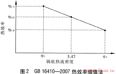 GB 16410—2007中的熱效率插值法是以鍋底熱流密度作為橫坐標(biāo),以熱效率作為縱坐標(biāo)建立直角坐標(biāo)系。當(dāng)用上限鍋測試熱效率時(shí),其橫坐標(biāo)點(diǎn)qU對應(yīng)的熱效率為ηF,U;用下限鍋測試熱效率時(shí),其橫坐標(biāo)點(diǎn)qD對應(yīng)的熱效率為ηF,D。然后以橫坐標(biāo)為5.47的豎直直線與ηF,U、ηF,D兩點(diǎn)連線的交點(diǎn)的縱坐標(biāo)值,作為此灶具燃燒器熱效率的最終結(jié)果η5.47(見圖2)。熱效率插值法是在不改變熱負(fù)荷的前提下得到的。