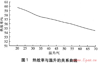 按照GB 16410—2007的測試要求,隨機(jī)選取多個(gè)燃燒器和測試用鍋,對不同溫升的熱效率進(jìn)行了測試計(jì)算,取均值后得出了熱效率與溫升的關(guān)系曲線(見圖1)。