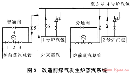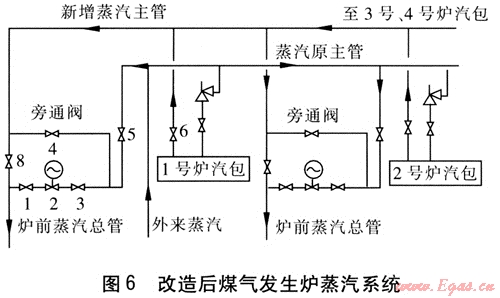 這樣,在正常運行時,8號閥全開,將自產(chǎn)蒸汽全部用于煤氣生產(chǎn),4號閥全關。不足部分通過主路上的2號閥來調節(jié)外來蒸汽進行補充。在生產(chǎn)負荷較小時,將8號閥關閉,4號閥全部打開,5號閥關閉,靠2號閥來調節(jié)白產(chǎn)蒸汽供入煤氣發(fā)生爐內的蒸汽量。