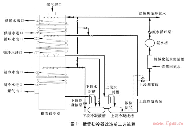 5臺橫管初冷器并聯(lián)操作,煤氣從橫管初冷器上部進入,為了保證初冷器對煤氣的冷卻效果,用水對煤氣分3段進行冷卻。上段冬季進水水溫為47℃,出水水溫為60℃,為合理利用熱量,將出水為附近居民供暖,回水再去上段冷卻煤氣,故該廠稱此水為供暖水。其余時間上段同中段一樣,用進水水溫為32℃、出水水溫為45℃的循環(huán)水對煤氣進行冷卻。下段用16℃制冷水將煤氣冷卻至18~22℃。為保證初冷器的冷卻除萘效果,在中、下段頂部連續(xù)噴灑焦油、氨水混合液,在上段頂部用熱氨水循環(huán)噴灑,以清除管壁上的焦油、萘等雜質(zhì)。初冷器上、中段排出的冷凝液經(jīng)水封槽流入上段冷凝液槽,用泵將其送入初冷器中段頂部循環(huán)噴灑,下段冷凝液槽內(nèi)多余的部分送到機械化氨水澄清槽。初冷器下段排出的冷凝液經(jīng)水封槽流入下段冷凝液槽,用泵將其送入初冷器下段頂部循環(huán)噴灑,下段冷凝液槽內(nèi)多余部分流入上段冷凝液槽。橫管初冷器改造前工藝流程見圖1。