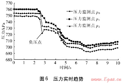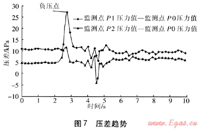 圖6為SCADA系統(tǒng)提供的壓力實時趨勢,P0是距離泄漏點最近的壓力測點,P2次之,P1最遠。由于負壓波傳輸需要一定的時間,P0具有明顯的負壓點,P1和P2的負壓點不太明顯。圖7為壓差趨勢,通過壓差比對判定壓差波動最大的時刻發(fā)生泄漏,泄漏位置在P0附近。在試驗過程中,城市燃氣管網(wǎng)泄漏在線檢測軟件同步運行,得出的結(jié)果與試驗實測結(jié)果對比,即可判定出軟件的準(zhǔn)確度。
