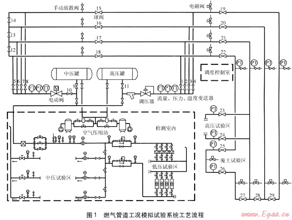 近幾年來,隨著供氣規(guī)模的日益擴大,為保證安全、可靠供氣和燃氣有效利用,燃氣管網(wǎng)優(yōu)化調(diào)度問題受到了普遍重視。為實現(xiàn)燃氣管網(wǎng)調(diào)度自動化,解決燃氣管網(wǎng)系統(tǒng)工況優(yōu)化以及管道事故分析等問題,涌現(xiàn)出了許多監(jiān)督控制、數(shù)據(jù)采集、仿真模擬、泄漏分析與定位軟件。這些軟件運行結(jié)果的準(zhǔn)確與否,直接影響管網(wǎng)系統(tǒng)的設(shè)計、投資和運行的可靠性。由于燃氣管網(wǎng)的特殊性,即使將軟件安裝在現(xiàn)場,也無法設(shè)置各種工況來檢驗軟件的可靠性,只能依靠軟件本身設(shè)定參數(shù)進行前期虛擬調(diào)試,軟件計算的準(zhǔn)確度、能否適應(yīng)不同工況、能否對運行中的突發(fā)事故做出正確響應(yīng)均無法得到有效驗證。本文介紹的燃氣管道工況模擬試驗系統(tǒng)是在充分研究城鎮(zhèn)燃氣輸配系統(tǒng)結(jié)構(gòu)的基礎(chǔ)上設(shè)計的,運行環(huán)境接近實際,工況設(shè)定靈活,可以模擬事故,為燃氣應(yīng)用軟件提供現(xiàn)場測試平臺。