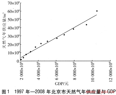 1997年—2008年北京市的GDP與天然氣年供應量見表1,對應關(guān)系見圖1,從圖1可知天然氣年供應量與GDP存在線性關(guān)系。
