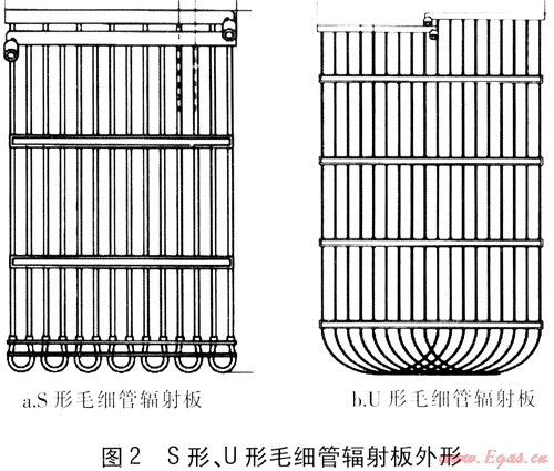 S形、U形毛細(xì)管輻射板外形見圖2。S形毛細(xì)管輻射板比較常用,它是由供回水主管和若干毛細(xì)管組成的。毛細(xì)管外徑為4.3mm,標(biāo)準(zhǔn)間距為20mm,還可以根據(jù)要求進行調(diào)整。管材可采用無規(guī)共聚聚丙烯管(PP-R管)、耐熱聚乙烯管(PE-RT管)、聚丁烯管(PB管)。安裝方式有隱蔽式、半隱蔽式:隱蔽式是將毛細(xì)管輻射板安裝在圍護結(jié)構(gòu)內(nèi)部;半隱蔽式是將毛細(xì)管輻射板安裝在圍護結(jié)構(gòu)表面,采用裝飾物遮擋。
