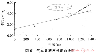 1) 第一種方法是根據(jù)油井產(chǎn)量和在油管內(nèi)測(cè)流壓梯度來(lái)分析氣舉井的注氣點(diǎn)位置,分析氣舉井是否存在多點(diǎn)注氣問(wèn)題,是否按照設(shè)計(jì)的注氣深度在正常工作[5~6],其氣舉井的流壓梯度曲線見(jiàn)圖5。