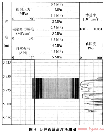 根據(jù)測(cè)井資料及有關(guān)參數(shù)處理了LG地區(qū)5口井的資料,求出了地層破裂壓力、裂縫高度的有關(guān)數(shù)據(jù),并繪制了裂縫高度延伸圖。