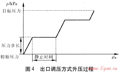 采用調(diào)壓器出口調(diào)壓方式進(jìn)行調(diào)壓時(shí),需設(shè)置的狀態(tài)參數(shù)包括壓力步長(zhǎng)、靜止時(shí)間、目標(biāo)壓力。壓力步長(zhǎng)是連續(xù)動(dòng)作的壓力變化值。靜止時(shí)間是每個(gè)壓力步長(zhǎng)動(dòng)作完成后至下一步長(zhǎng)開(kāi)始的停頓時(shí)間。目標(biāo)壓力是需升壓或降壓后達(dá)到的壓力。控制器按設(shè)定的壓力步長(zhǎng)、靜止時(shí)間運(yùn)行,出口壓力傳感器將出口壓力p的信號(hào)反饋到控制器,當(dāng)p等于目標(biāo)壓力時(shí),升壓或降壓停止。圖4為采用出口調(diào)壓方式進(jìn)行升壓的過(guò)程。