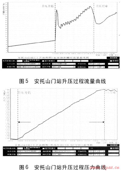 在調(diào)壓方面的應(yīng)用主要是通過(guò)手動(dòng)控制或出口調(diào)壓方式來(lái)實(shí)現(xiàn)升、降壓。在初期建議采用手動(dòng)控制方式進(jìn)行,通過(guò)摸索,尋找合適的壓力步長(zhǎng)、靜止時(shí)間,再采用出口調(diào)壓方式。在升壓過(guò)程中如果設(shè)置步長(zhǎng)過(guò)大、靜止時(shí)間過(guò)短,則流量上升速率過(guò)大,造成進(jìn)口壓力下降太快,可能造成上游過(guò)流閥切斷;在降壓時(shí)則造成調(diào)壓器閥口開(kāi)度過(guò)小,流量下降速率過(guò)大,造成進(jìn)口壓力過(guò)高,甚至達(dá)到上游緊急切斷閥切斷壓力值。如果步長(zhǎng)過(guò)小、靜止時(shí)間過(guò)長(zhǎng),則達(dá)到目標(biāo)壓力所需的時(shí)間過(guò)長(zhǎng)。通過(guò)摸索,壓力步長(zhǎng)為10~20kPa、靜止時(shí)間在10min左右,壓力、流量的變化較為平穩(wěn)。不同時(shí)段下游用氣量不同,壓力步長(zhǎng)及靜止時(shí)間的設(shè)置也不盡相同。廠站人員在剛開(kāi)始調(diào)壓時(shí)通常采用手動(dòng)方式,實(shí)施數(shù)次后,觀察流量及上下游壓力變化,選擇出合理的壓力步長(zhǎng)及靜止時(shí)間。圖5、6為改造后安托山門站將壓力由1.341MPa升至1.51MPa的流量、壓力曲線。