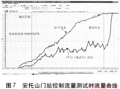 目前兩座門站沒(méi)有設(shè)置限流裝置,上游也沒(méi)有對(duì)門站采取限流。當(dāng)出站壓力保證穩(wěn)定,不采取降壓以利用次高壓管道的管道儲(chǔ)氣的情況下,在用氣高峰時(shí)段,流量超過(guò)合同規(guī)定的最大提取速率,超過(guò)最大提取速率提取的氣量將按正常價(jià)格的150%計(jì)價(jià)。針對(duì)以上實(shí)際情況,將壓力遙調(diào)的功能進(jìn)行拓展,通過(guò)在高峰時(shí)段降低出口壓力,減小調(diào)壓器開(kāi)度,從而間接地降低流量。在高峰時(shí)段需頻繁降壓,將流量控制在上游要求的最大提氣速率的95%以內(nèi),用戶需求的不足部分通過(guò)降低管道壓力、利用管道儲(chǔ)氣來(lái)補(bǔ)充。低峰時(shí)升高壓力來(lái)補(bǔ)充管道儲(chǔ)氣。這種頻繁的調(diào)整,在沒(méi)有遙調(diào)系統(tǒng)的情況下是很難實(shí)現(xiàn)的。圖7、8為改造后安托山門站晚高峰控制流量測(cè)試時(shí)的流量、壓力曲線。