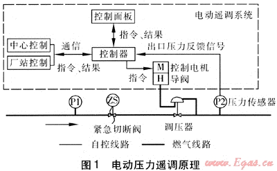 電動(dòng)調(diào)節(jié)系統(tǒng)主要由控制器、壓力傳感器和控制電機(jī)組成。中心控制、廠站控制或控制面板給控制器輸入指令,控制器給控制電機(jī)信號(hào),控制電機(jī)直接旋擰調(diào)壓器導(dǎo)閥的調(diào)壓螺桿,實(shí)現(xiàn)調(diào)壓。調(diào)壓過(guò)程中,控制器將調(diào)壓器出口處壓力傳感器的反饋值與指令目標(biāo)壓力值比較,根據(jù)比較結(jié)果來(lái)控制電機(jī)操作,直至調(diào)節(jié)到目標(biāo)壓力,停止動(dòng)作。該方式調(diào)壓范圍寬,是直接的機(jī)械式作用。電機(jī)為防爆電機(jī),供電壓力為220V。電動(dòng)壓力遙調(diào)原理見(jiàn)圖1。