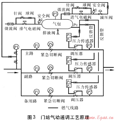 深圳市燃?xì)饧瘓F(tuán)股份有限公司門站氣動(dòng)遙調(diào)系統(tǒng)的工藝原理見(jiàn)圖3。