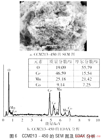 ③ 對樣品CCM213-450,通過SEM的分析,在催化劑表面呈現(xiàn)出大量蜂窩狀多孔結(jié)構(gòu),該結(jié)構(gòu)有利于NO及O2的吸附及氧化;EDAX測試表明,Ce、Co、Mn、O這4種元素的物質(zhì)的量比約為2:1:3:7.5。