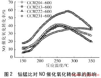 圖2考察了鈷錳比(此處指鈷錳物質(zhì)的量的比,簡稱為鈷錳比)對NO催化氧化轉(zhuǎn)化率的影響。由圖2可知,當(dāng)Ce、Co、Mn物質(zhì)的量的比為2:1:3,反應(yīng)溫度為282℃時,催化氧化轉(zhuǎn)化率最高,達(dá)到58%;其他3個樣品的轉(zhuǎn)化率則相對較低。隨著錳含量的增加,催化劑的最高催化活性也有所增強(qiáng),但繼續(xù)增加錳而減少鉆時,催化劑的催化氧化活性在一定程度上又降低,表明了鈷錳具有協(xié)同效應(yīng),且1:3為該效應(yīng)的最佳比例。值得注意的是,當(dāng)Ce、Co、Mn物質(zhì)的量的比為2:3:1時,NO催化氧化轉(zhuǎn)化率隨溫度升高后下降較慢,表現(xiàn)出該催化劑具有一定的溫度適應(yīng)性。