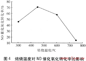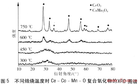 analyses of the samples show that when the calcinations temperature is equal to or less than 450℃.the catalyst has an amorphous state,a large number of pore channels and a large specific surface area. The crystalline phase separation occurs at 600℃.and the spinel phase occurs on the catalysts surface at 750,which leads to a drastic reduction of the activity.