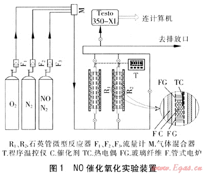 目前,NOx的主要來源為電廠、供熱鍋爐煙氣及汽車尾氣,且90%~95%為NO[1、2]。應(yīng)用于NOx脫除的各類方法包括:選擇性催化還原法(SCR)、連續(xù)再生捕集(CRT)、NOx儲存與還原(NSR)及濕法脫硝等,這些方法的共同點(diǎn)為在NOx脫除時NO2比NO具有更高的活性[3~5]。因此,如能將NO選擇性催化氧化為NO2,對于各類脫氮方法都將是一項重要的貢獻(xiàn)。根據(jù)NO與O2的化學(xué)反應(yīng)方程及反應(yīng)機(jī)理[6]可知,該反應(yīng)在熱力學(xué)上是可行的,但在常溫下,由于NO的弱極性及化學(xué)性質(zhì)的穩(wěn)定性,它們的反應(yīng)速度非常緩慢。NO選擇性催化氧化過程是指在催化劑及一定的反應(yīng)溫度下,將NO催化氧化為NO2,然后根據(jù)不同的脫除方法選擇不同的操作方式。如濕法脫硝過程,當(dāng)氧化度提高到50%~60%時,液相吸收劑(如腐植酸鈉、氨水及Na2CO3)對NOx將取得最佳吸收效率[2]