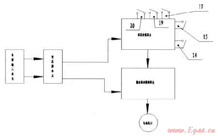 在本具體實施例中,如圖1和圖2所示,所述轉(zhuǎn)軸12的一端與設(shè)置在灶具主殼體5內(nèi)的電動機13的轉(zhuǎn)軸連接;所述轉(zhuǎn)軸固定架11上設(shè)有上限位開關(guān)14;所述燃燒機構(gòu)前端設(shè)有下限位開關(guān)15;所述電動機13、上限位開關(guān)14及下限位開關(guān)15均與控制電路板16電連接;所述控制電路板1 6 1-還電連接有電源輸入控制開關(guān)17、上升開關(guān)19及下降開關(guān)20。所述的電動機13、上限位開關(guān)14、下限位開關(guān)15、上升開關(guān)19、下降開關(guān)20以及控制電路板16組成一個可控制轉(zhuǎn)軸12轉(zhuǎn)動的轉(zhuǎn)軸自動轉(zhuǎn)動裝置。