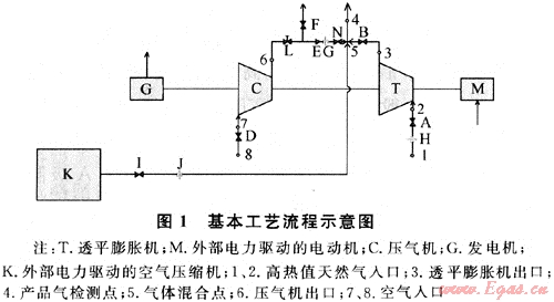 調(diào)壓站內(nèi)天然氣熱值自平衡技術(shù)基本工藝流程如圖1所示。它利用透平膨脹機(jī)代替?zhèn)鹘y(tǒng)調(diào)壓設(shè)備將高壓天然氣降壓[3],并將此過程的壓力能轉(zhuǎn)化成驅(qū)動(dòng)能,帶動(dòng)壓氣機(jī)生產(chǎn)壓縮空氣[4~5]摻混到已降壓的高熱值天然氣中,使調(diào)壓站出站天然氣熱值得以降低,其壓力等各項(xiàng)技術(shù)參數(shù)均與目標(biāo)值一致。一般情況下,此過程不需要外部動(dòng)力驅(qū)動(dòng)壓氣機(jī),而是回收利用“與生俱來”的天然氣壓力能。