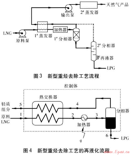 本文提出一種不同于以往的新型重?zé)N去除工藝:將過冷態(tài)LNG的冷能用于凝結(jié)從分相器內(nèi)重組分中蒸餾分離出來的輕質(zhì)LNG組分[1]。目前LNG的冷能利用[2~7]主要有:冷能發(fā)電、空氣分離、冷凍倉庫、液化二氧化碳、熱電循環(huán)等。本文將冷能的應(yīng)用范圍擴(kuò)大至再液化流程。