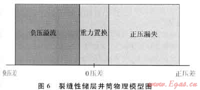 由于裂縫性儲層不滿足達西滲流條件,滲流阻力很小,導(dǎo)致井內(nèi)壓差沒有安全窗口,取而代之的是一個很小的重力置換窗口。壓差小于重力置換窗口發(fā)生負壓溢流;大于重力置換窗口,發(fā)生正壓漏失;在重力置換窗口內(nèi),有溢有漏,處于動態(tài)交換狀態(tài)。裂縫性儲層井筒物理模型如圖6所示。