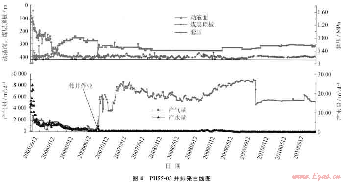 進(jìn)入穩(wěn)定生產(chǎn)階段后,宜采用定產(chǎn)排采制度,此階段應(yīng)避免單井產(chǎn)氣量的大幅度波動(dòng)。需要進(jìn)行單井產(chǎn)量調(diào)節(jié)時(shí),一般通過(guò)調(diào)整動(dòng)液面及套壓進(jìn)行產(chǎn)量調(diào)節(jié),主要分兩種情況:①動(dòng)液面較高的井,主要通過(guò)增加抽油機(jī)沖程沖次或提高管式泵泵效的方法,通過(guò)降低動(dòng)液面來(lái)降低井底流壓,達(dá)到提產(chǎn)的目的;②動(dòng)液面接近煤層頂板的井,一般通過(guò)調(diào)整套壓調(diào)整井底流壓,調(diào)壓時(shí)一般單日內(nèi)套壓變化不超過(guò)0.2MPa。