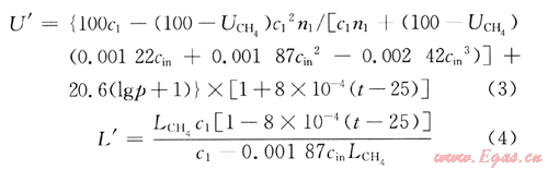 含氧煤層氣在壓縮機(jī)壓縮過程中一直保持氣態(tài),因此其爆炸極限受2個因素即溫度和壓力的影響。含氧煤層氣中的可燃物是CH4,其爆炸上、下限公式為[17]:
