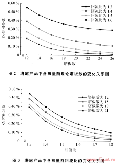 在精餾塔為進(jìn)料狀態(tài),塔頂及塔底采出量固定的情況下,塔底產(chǎn)品中氧氣含量受2個主要參數(shù)即回流比和理論塔板數(shù)的影響。在精餾塔進(jìn)料壓力為0.2MPa,溫度為-164℃的條件下,不同回流比條件下塔底產(chǎn)品中氧氣含量與理論塔板數(shù)的關(guān)系如圖2所示,不同理論塔板數(shù)條件下塔底產(chǎn)品中氧氣含量與回流比的關(guān)系如圖3所示。由圖2可知,在固定回流比的情況下,塔底產(chǎn)品中的氧氣含量隨著理論塔板數(shù)的增加而降低,而且隨著理論塔板數(shù)的增加,氧氣含量曲線逐漸變得平緩,也就是說在精餾塔塔板數(shù)比較多時,通過增加塔板的數(shù)量來降低煤層氣中的氧氣含量的效果已經(jīng)不明顯。圖3反映出在理論塔板數(shù)量固定的情況下,塔底產(chǎn)品中的氧氣含量隨回流比的增加而降低,而且曲線隨著回流比的增加也逐漸變得平緩,說明回流比較大時,再依靠增加回流比來降低煤層氣中的氧氣含量的效果也不明顯。由此可知,不能只依賴調(diào)節(jié)某一個參數(shù)來降低煤層氣中的氧氣含量,而是要同時考慮其他參數(shù)來綜合調(diào)節(jié)。模擬計算過程中,在精餾塔進(jìn)料壓力為0.2MPa,溫度為-164℃,回流比為1.4,理論塔板數(shù)為25的情況下,塔底產(chǎn)品中氧氣的含量為0.16%(體積分?jǐn)?shù)),此時產(chǎn)品中的氮氣為0。