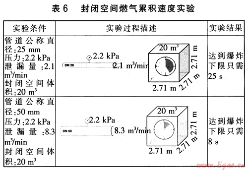 為了準確地描述封閉空間燃氣累積速度,以便在發(fā)生災害時進行確切的評估,我們做了下列封閉空間天然氣累積速度實驗,見表6。