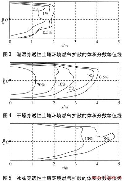 圖2為干燥穿透性土壤環(huán)境燃氣擴散的體積分數(shù)等值線,圖3為潮濕穿透性土壤環(huán)境燃氣擴散的體積分數(shù)等值線。